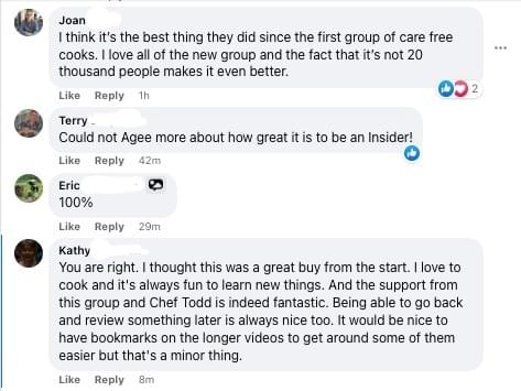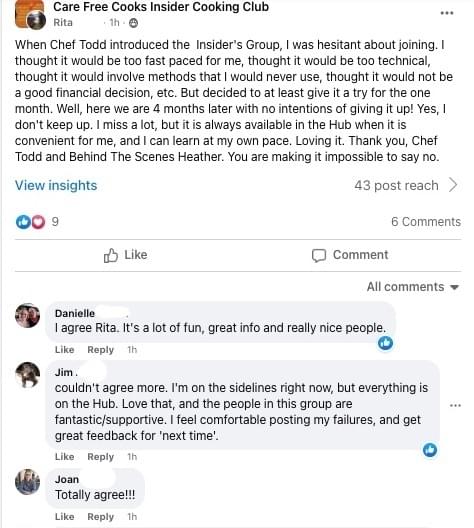 The Care Free Cooks Insider Cooking Club (Or Insiders, as we affectionally call ourselves) is a limited size membership that brings care free cooks closer to Chef Todd and allows them to hone their cooking skills on a new level with more hands-on classes, live and interactive workshops and direct Q/A access to Chef Todd. It is designed to provide more in-depth and personalized small group cooking instruction as well as a close-knit community of other cooks who share ideas, support, encouragement and successes together.